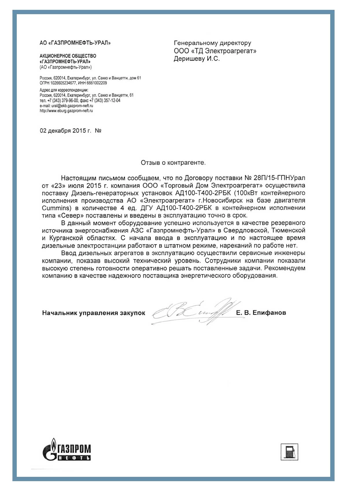 Отзыв контрагентов о компании ООО «ТД Электроагрегат» и  исполненном проекте для АО "Газпромнефть-Урал", г. Екатеринбург